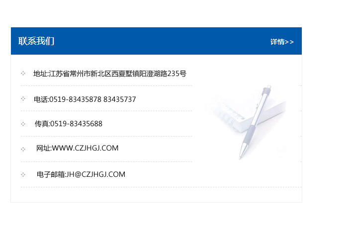 地址:常州市新北區(qū)友邦商務(wù)大廈1幢16、17層  電話:0519-85101652  傳真:0519-85112595  郵編:213022  網(wǎng)址:www.cz-jiayue_cn.yuchengyishu.com  郵箱:xiajifengaa@163.com